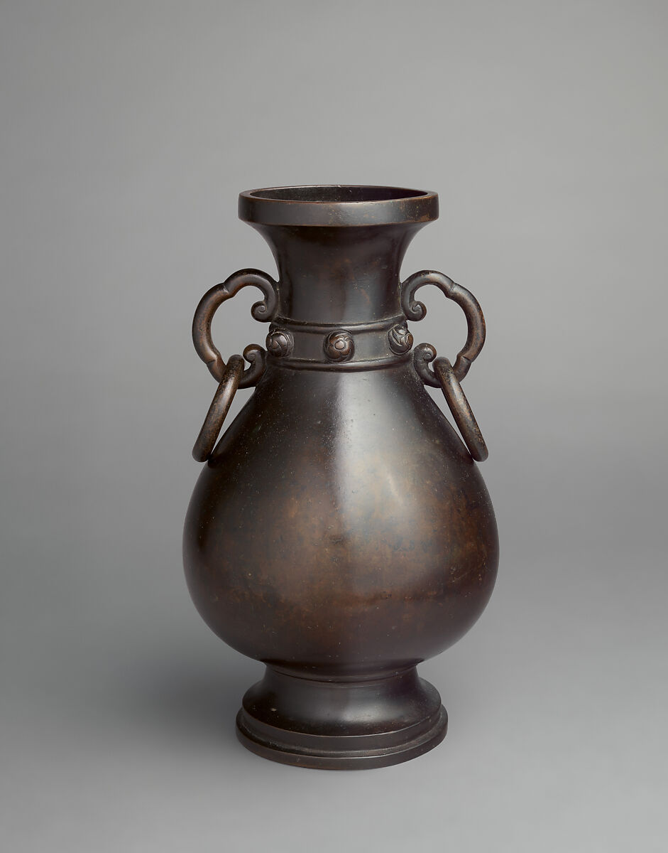 These vases’ bulbous bodies and cloud-shaped loop handles with rings resonate stylistically with the Ming imperial altar vase at the Qutan Monastery. Although they bear no reign marks or gilding, their imposing form and fine casting indicate that they were products of the imperial workshops of the fifteenth century. Originally, they served as flower vases on a ritual altar, where they would have been placed together with an incense burner and two candlesticks.