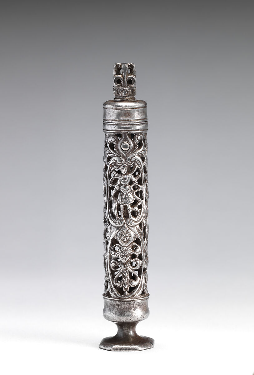 This sealing wax case would have been used to store sealing wax; the faceted end was then used to impress the melted wax with the owner’s cypher, in this case conjoined R’s. The foliate pattern with classicized figures is common among comparable objects, however the openwork is less so. Unlike the other, later, French cases with seals in the department’s collection, this example was produced in iron, demonstrating the range of material production, particularly at this earlier date.