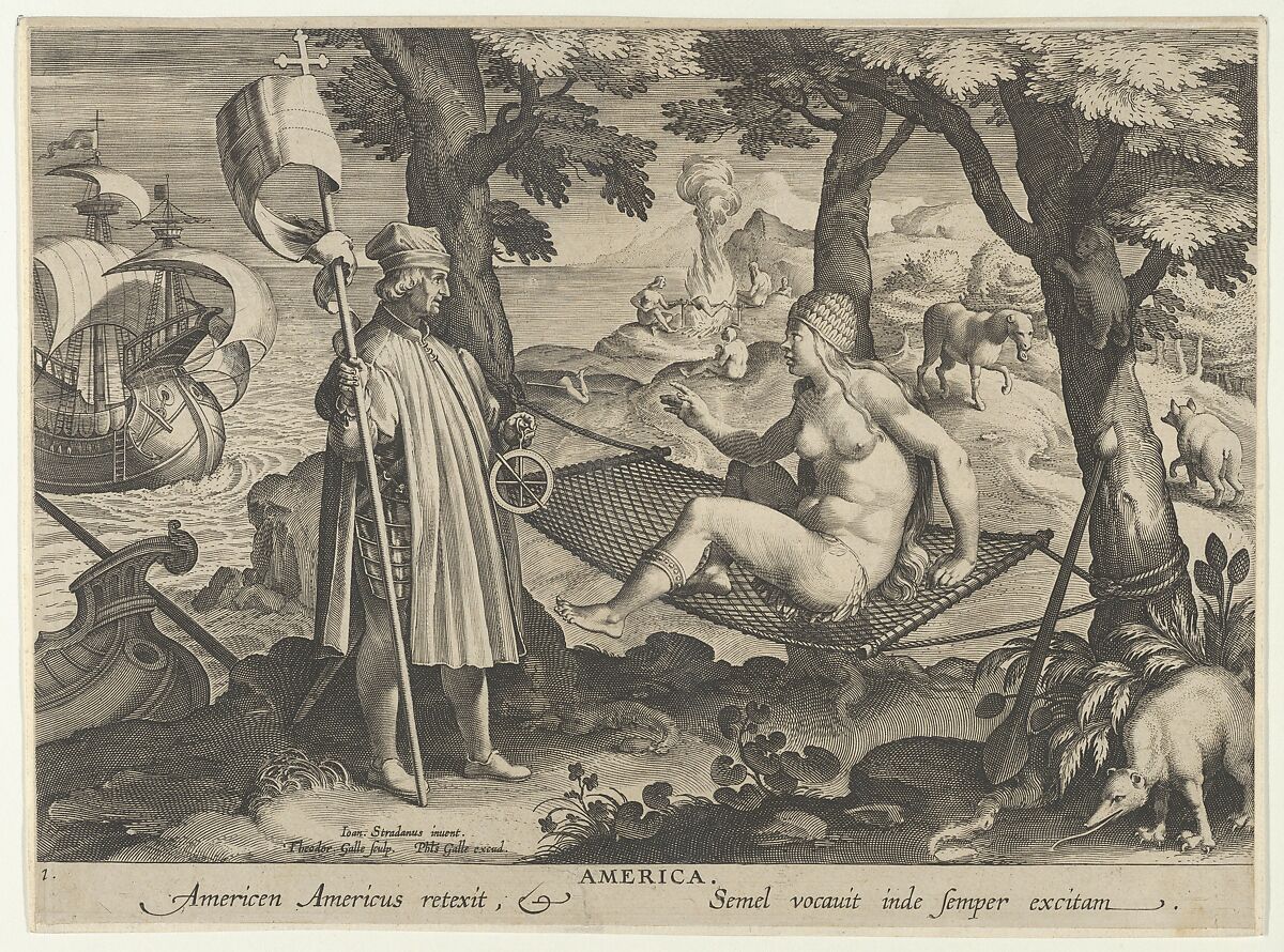 This is the first plate from the series entitled Nova Reperta, which surveys new inventions and discoveries made during the Renaissance from a European perspective. In this engraving, the Florentine explorer Amerigo Vespucci is shown as he first encounters America. Stradanus presents the continent as an allegorical figure; a sexualized young woman gesturing towards Vespucci from her hammock. She wears only a feathered headdress and skirt, her club abandoned against the tree at the right, where an anteater is shown feasting. Set behind her in the rolling landscape are other animals associated with the Americas—a horse and a bear. Also depicted is a scene of cannibalism.