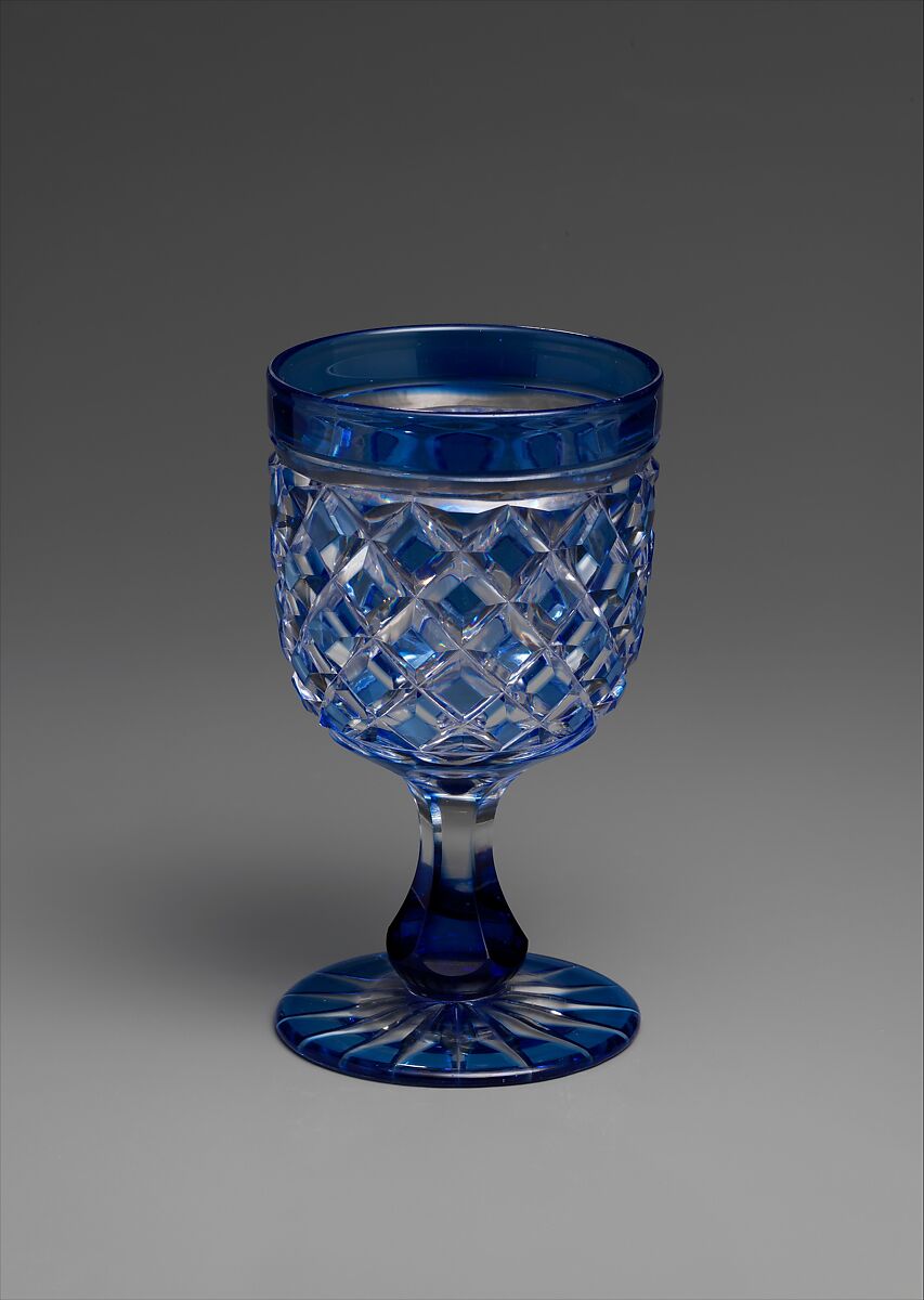 New York City was an important center for machine-cut luxury glass in the middle of the nineteenth century. This partial group (2014.626.1a,b -.7) of blue-cut-to-clear glass is extraordinarily rare and perhaps even experimental when it was made in the 1850s. This is the only known blue plated cut glass attributed to the Brooklyn Flint Glass Works. The diamond pattern is thought to have been executed by Joseph Stouvenel, a highly skilled glass cutter whose works were exhibited at the New York Exhibition of 1853–54 and published during the period.