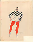 Drawing, design for a man's costume for the musical 'At Home Abroad', premiered in Broadway, New York, on 19 September 1935, with stage production and scenic design by Vincente Minnelli. The costume, possibly for a circus performer, consists of a black and white checked shirt with wide sleeves and white shorts, worn over red tights with high-heeled, pointed-toe, white anke boots. The male figure represented wearing the design has short, black hair and a thin, elongated, scrolling, black moustache.