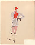 Drawing, design for a woman's costume, part of a group of 88 costume designs by Vincente Minnelli. The costume consists of a gray suede jacket and matching shorts, embroidered in brown, worn over a red waistcoat. Both the jacket and the shorts have large, closed pockets. A red felt hat with a large feather, brown gloves, and white socks with brown tassels, worn with matching white and brown shoes complete the outfit. The female figure in the drawing stands with her weight on her left foot, her left hand on her hip, and the right hand holding a thin, long cane.