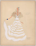 Drawing, study of a woman's costume, part of a group of 88 costume designs by Vincente Minnelli. The costume consists of a white gown with white bands on the skirt, worn under a short gold mesh cape, tied at the front of the neck with a floral brooch, and a bracelet with semi-abstract blue flowers. A flower of the same kind is worn on the short, undulated hair.