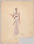 Drawing, design for a woman's costume, part of a group of 88 costume designs by Vincente Minnelli. The costume consists of a long beige dress with white lace collar, tied at the front with a small, brown bow, a brown sash holding a white lace apron, and slightly flared skirt. The dress is worn with a small, brown hat with hanging strips of lace, white socks and pointed-toe, brown shoes.
