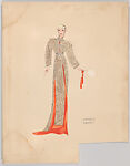 Drawing, design for a woman's costume, part of a group of 88 costume designs by Vincente Minnelli. The costume consists of a beige, kimono-inspired coat with scrolling, semi-abstract floral patterns and three horizontal fastenings across the torso, worn over a long, orange-red dress with short train. The woman represented wearing the costume has short, wavy platinum-blonde hair, wears large jeweled earrings with orange-red (coral?) details and matching bracelet on her right hand, and holds a white fan with orange-red tassels on the left hand. On the verso, an unfinished sketch of another woman's costume presents a figure-hugging long dress, laced at the torso, and with a thin, long belt, worn with a large shawl (?) and tulle (?) headdress.