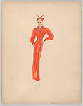 Drawing, design for a woman's costume, part of a group of 88 costume designs by Vincente Minnelli. The costume consists of an orange street dress with gold trimmings on the collar and sleeves, the waist wrapped in an orange belt with triangular gold buckle, worn with an orange and gold headscarf wrapped around the haur and golden earrings.