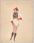 Drawing, design for a woman's costume, part of a group of 88 costume designs by Vincente Minnelli. The costume was designed for the number 'O Leo', from the musical 'At Home Abroad', created for the Shuberts and performed in Broadway in 1935. It consists of a white jacket with brown lapels over a brown turtleneck top and white shorts (or skirt?) with semi-abstract brown motifs and golden stars on the waistband, long, brown socks with green bands and tassels, brown pointed-toe shoes, long, red gloves, and red hat with green feather.