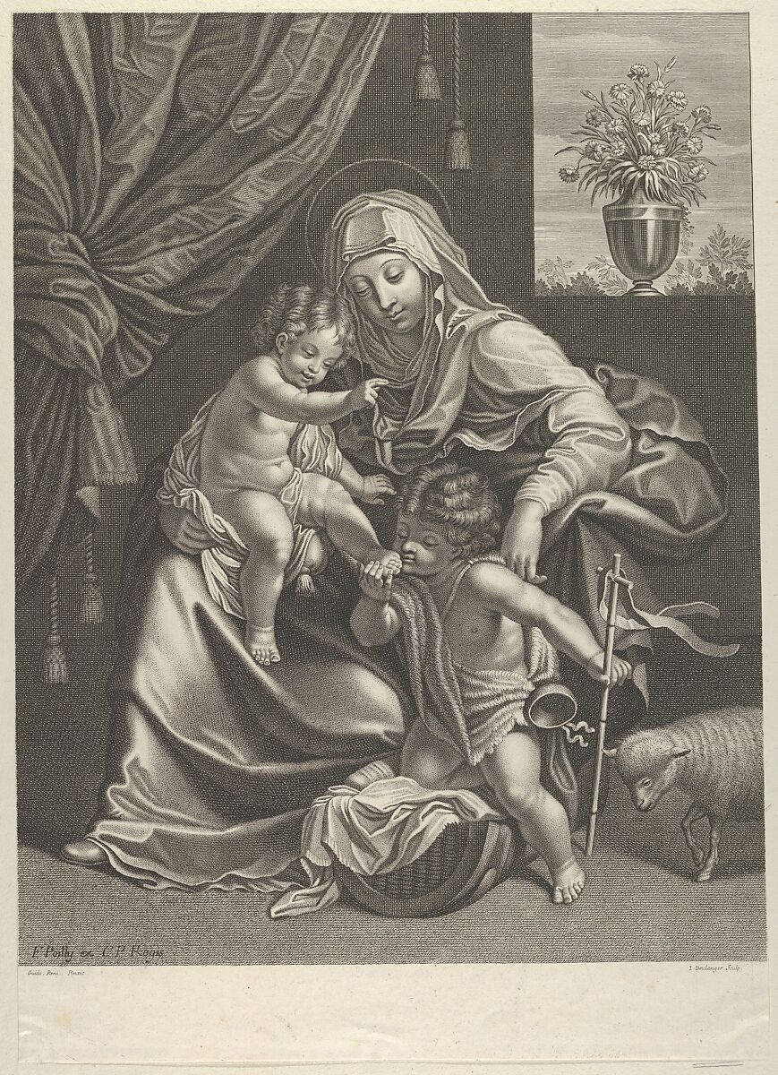 - Title: The Virgin seated with the infant Christ on her lap, the young Saint John the Baptist kneeling on Christ's cradle and kissing his foot, a lamb at right, after Reni
