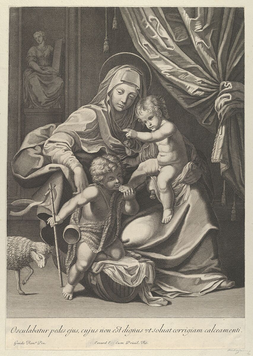 - Title: The Virgin seated with the infant Christ on her lap, the young Saint John the Baptist kneeling on Christ's cradle and kissing his foot, a lamb at left, after Reni