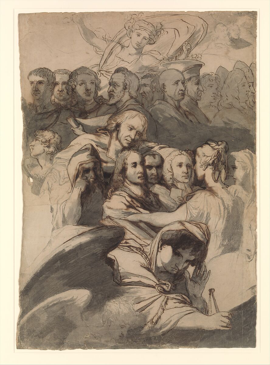 This drawing reproduces figures from the center of Barry’s painting Elysium and Tartarus (1777–83), which hangs in the Great Room of the Society of Arts, London, and celebrates "those great and good men of all ages and nations, who were cultivators and benefactors of mankind." At top, patrons of the arts include Trajan, Titus, Peter the Great, Henry IV of France, Andrea Doria of Genoa, Scipio Africanus, Cosimo de’ Medici, Alexander the Great, Louis XIV, and Pope Julius II. At center, the theologians Origen, Pascal, Bossuet, Antoine Arnauld, and Bishop Butler converse with angels. Below, the sublime form of Divine Justice tilts her scales toward the abyss to suggest that evil has generally prevailed over good in history.