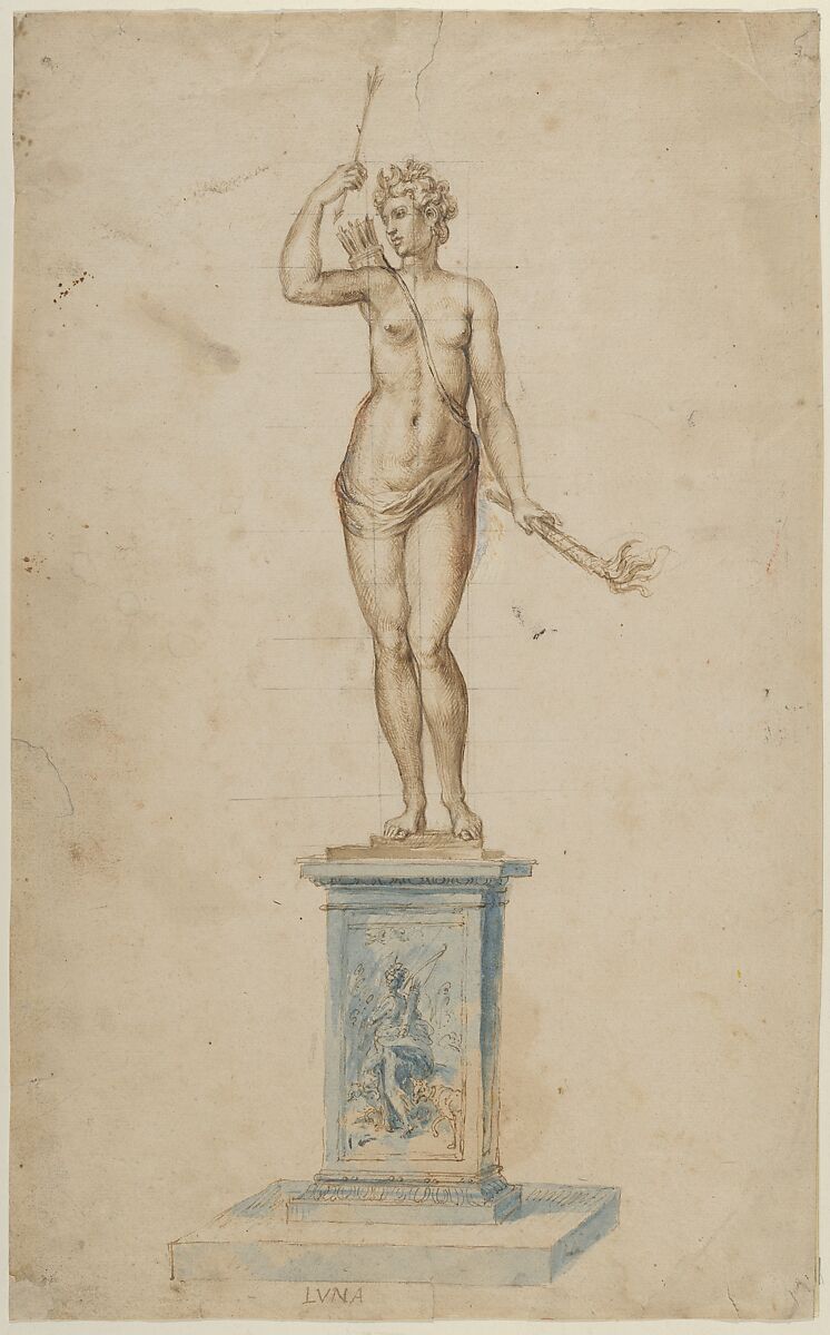 This drawing shows a statue of the goddess Diana in her role as a personification of the moon (often known by the epithet Luna, as the sheet is inscribed)—one of a set of eight lifesize bronzes representing the "seven planets," together with a seated Bacchus, that Jacques Jonghelinck produced in Brussels between 1563 and 1573. These statues were commissioned by the sculptor’s brother, Niclaes Jonghelinck, and were most likely destined for his suburban home outside Antwerp, where cycles of paintings by Frans Floris and Pieter Bruegel the Elder, including the latter’s celebrated Months cycle (see 19.164), already hung, possibly intended, together with Jonghelinck’s Planets, as a cohesive cosmographic program.[1] Rediscovered in Spain in the 1970s, the monumental statues rank among the most important surviving examples of sixteenth-century Flemish sculpture.[2]