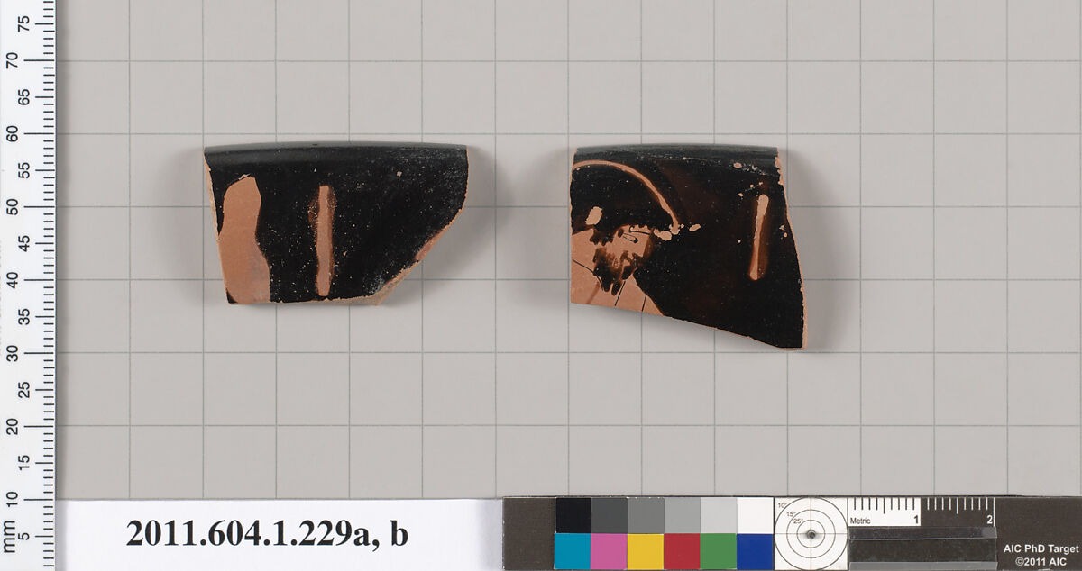 Exterior, one rim fragment has a pair of sandals in the field; the second rim fragment has the head of bearded man to right and a sandal or fillet in the field