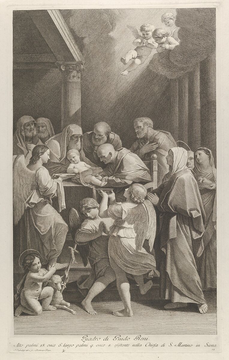 - Title: The circumcision of Christ, a group of men, women and angels surrounding him, the young Saint John the Baptist at lower left, after Reni