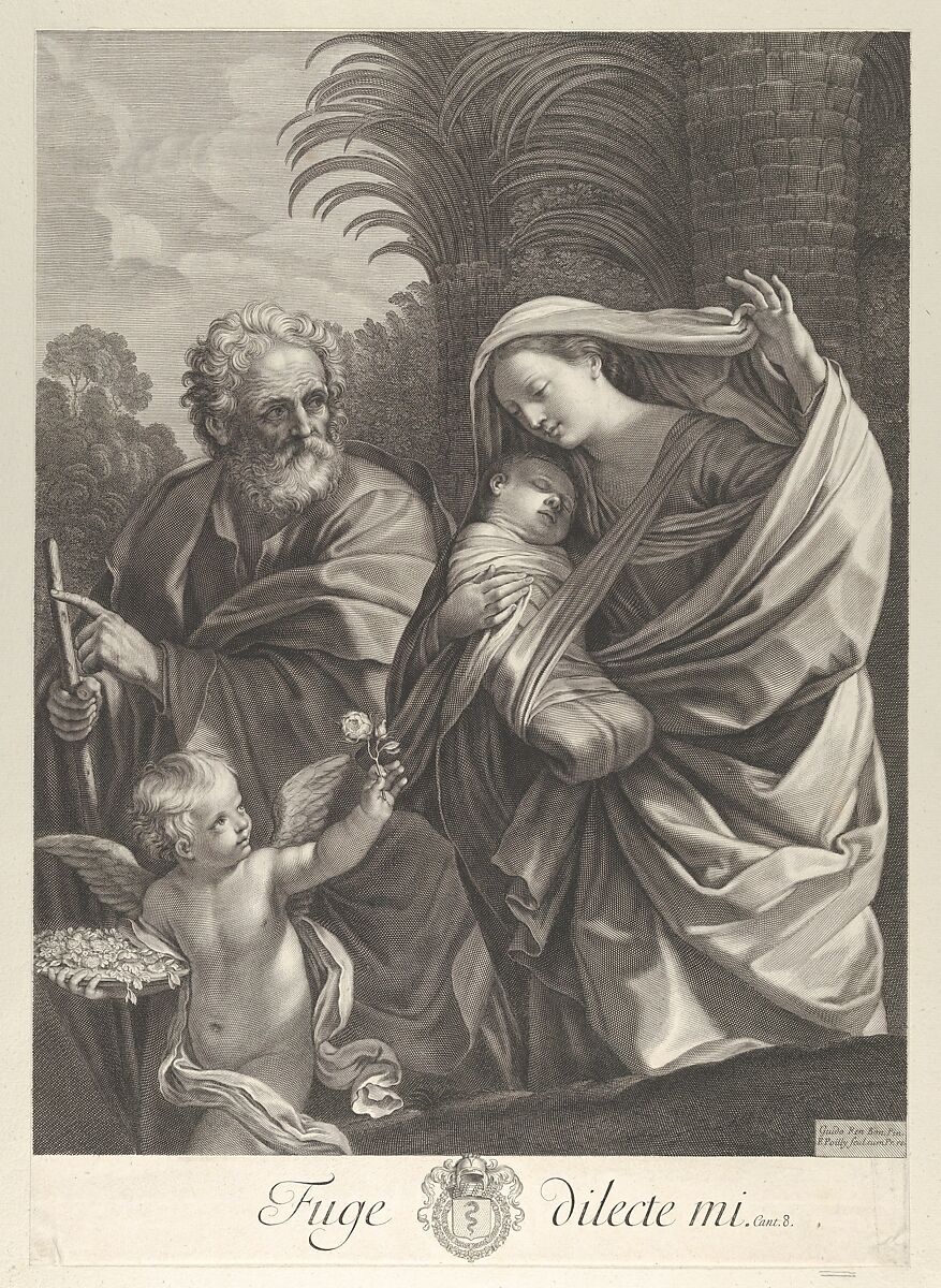 - Title: The Flight into Egypt; the Holy Family walking together, Saint Joseph pointing to the left and the Virgin carrying the infant Christ, an angel in front of her offering a flower, after Reni