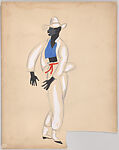 Drawing, design for a man's costume, part of a group of 88 costume designs by Vincente Minnelli. The costume consists of white jacket and trousers, a blue crop top, red belt, white socks, flat, pointed-toe, black shoesand white, wide-brimmed hat.