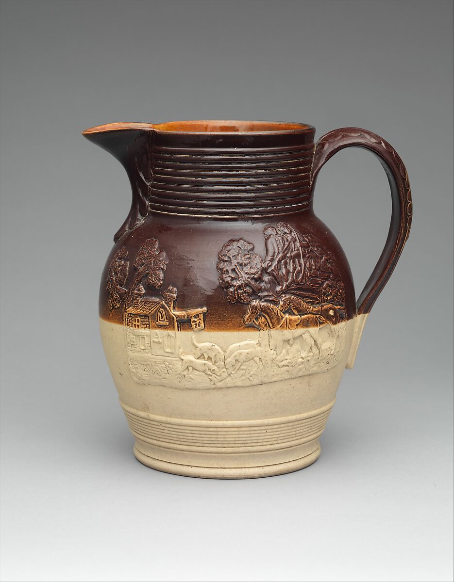 Rockingham ware, named after the Rockingham Pottery in England, is loosely defined as earthenware pottery embellished with a mottled brown glaze, often with relief-molded decoration. It was produced in the United States in the decades of the middle of the nineteenth century, a significant era for the American pottery industry when British workers, designers, and mold makers emigrated from England’s flourishing Staffordshire potting district, bringing with them British factory practices, techniques, and designs. Many examples are direct copies of their British prototypes; others are loosely inspired by them. The earliest in this country date to the early 1830s, and such ware continued through the third quarter of the nineteenth century. It was produced at numerous potteries from Trenton and Jersey City, New Jersey, to Connecticut, Baltimore, and Ohio. Such distinctive vessels, with their naturalistic decoration were a feature in middle-class households throughout the country.