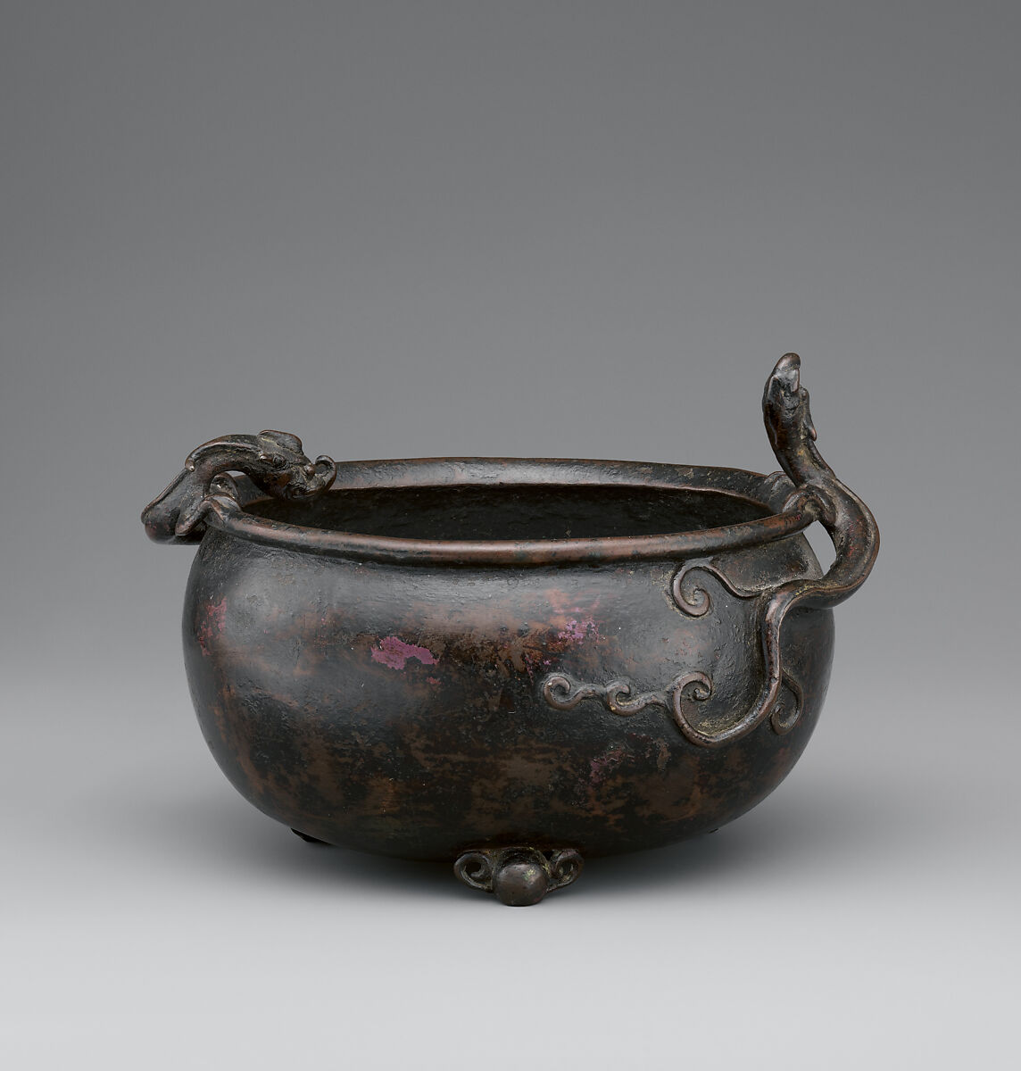 This charming bronze was designed as a brush washer for holding water to dampen writing brushes or to dilute the ink tone when writing or painting. A pair of sinuous dragons cast along the rim enlivens this modest vessel.