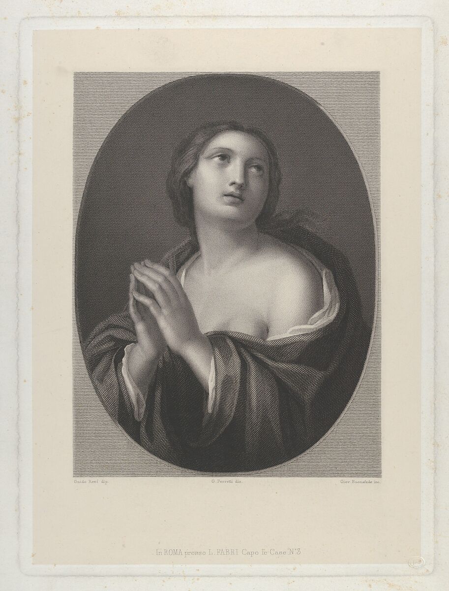 - Title: Female personification of Hope looking up with hands held together and left shoulder exposed, in an oval frame, after Reni