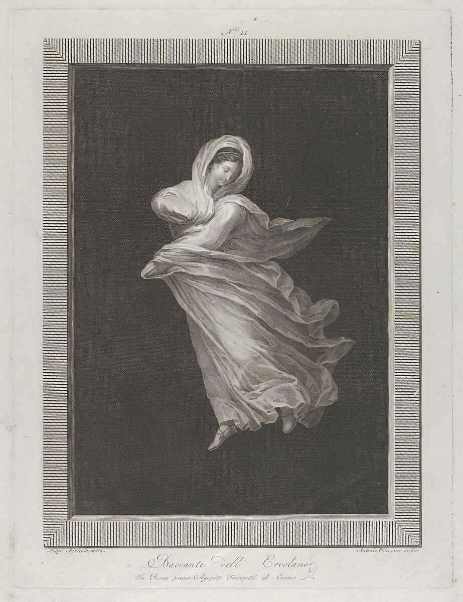 - Title: A bacchante wearing a flowing drapery, looking down, right arm bent and left arm outstretched, set against a black background inside a rectangular frame