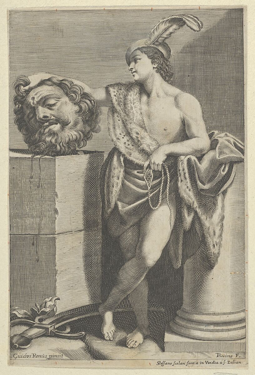 - Title: David standing with crossed legs and holding the head of Goliath on a pedestal at left, a sword on the ground, after Reni