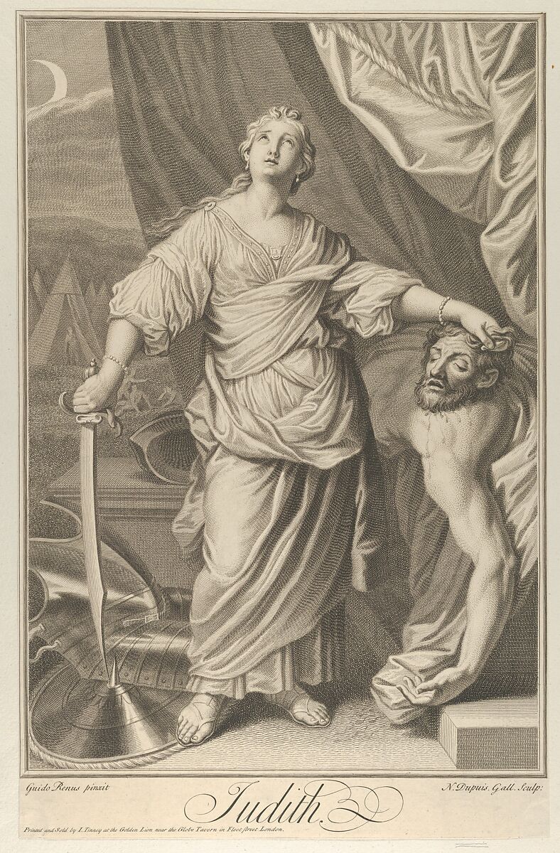 - Title: Judith standing and looking up, holding the head of Holofernes in her left hand and a sword in her right, tents in the background, after Reni