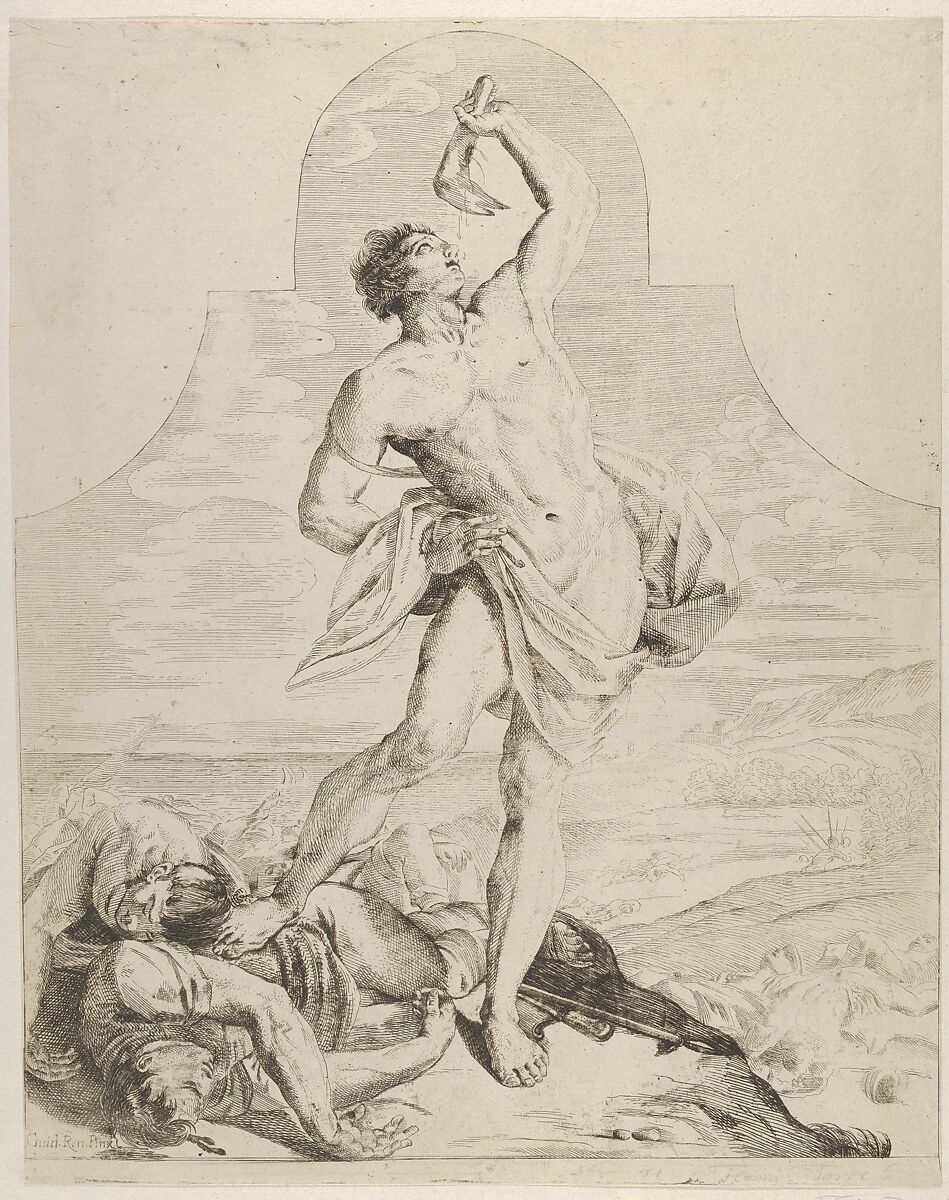 - Title: Samson holding the jaw bone of an ass over his head and standing next to the Philistines he has just killed, more dead bodies in the background, a tapered composition with rounded top, after Reni