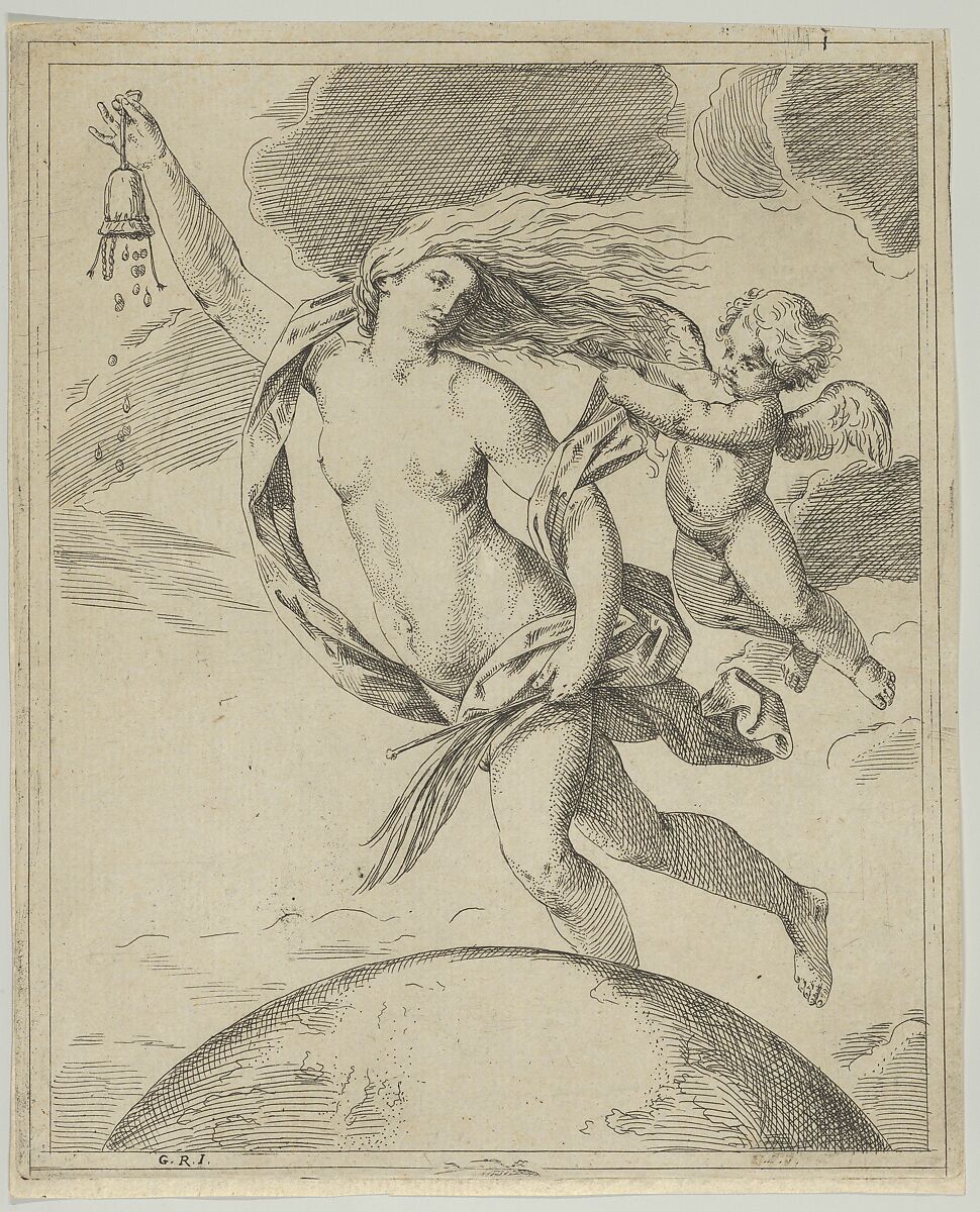 - Title: Fortune flying above the globe, partly naked, emptying a purse in her raised right hand and holding a staff in her left, a winged putto pulling her forelock, after Reni