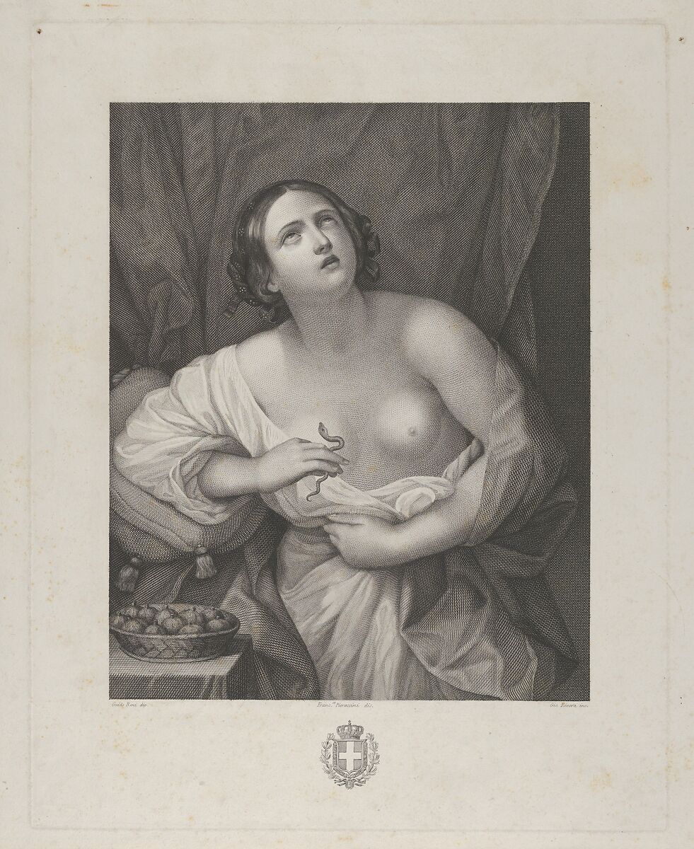 - Title: Cleopatra looking upwards while holding an asp in her right hand and clutching at her stomach with her left, a bowl of figs at left, after Reni