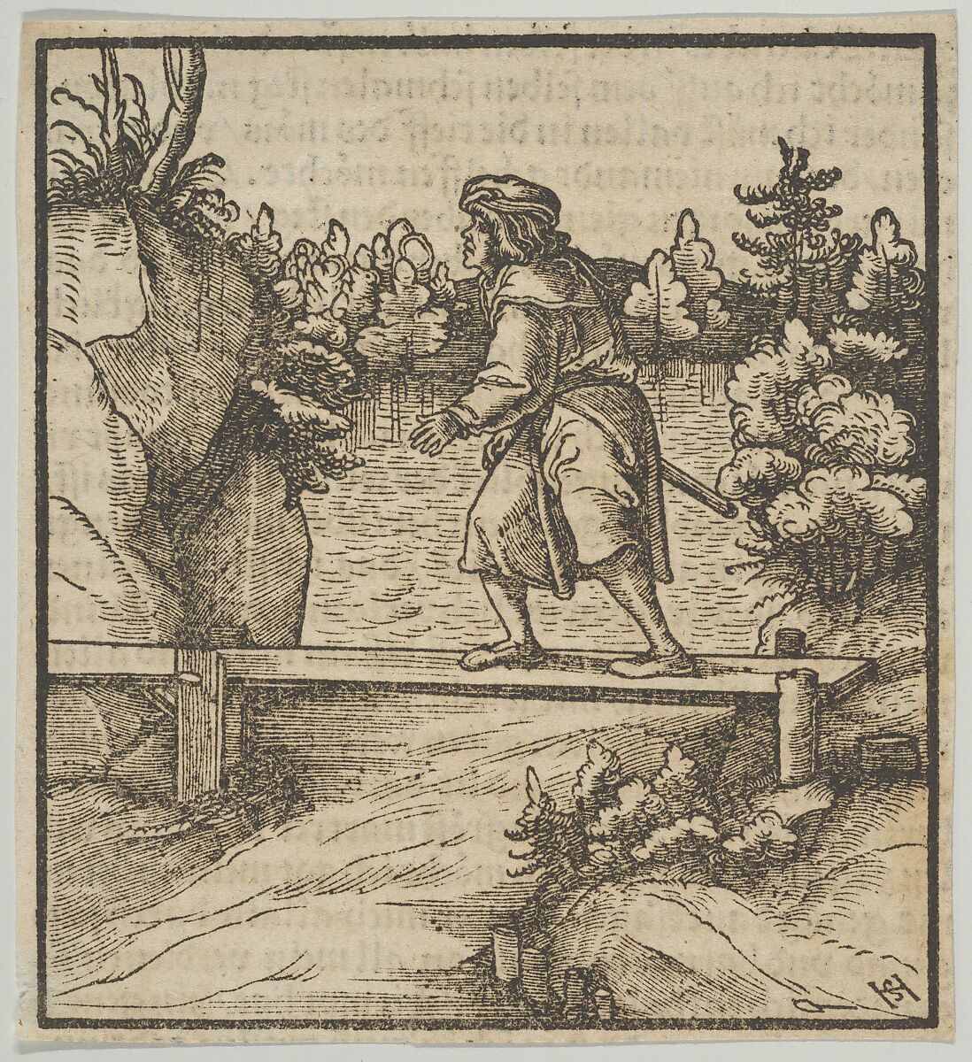 - Title: A Man Crossing a Small Bridge, from Hymmelwagen auff dem, wer wol lebt...