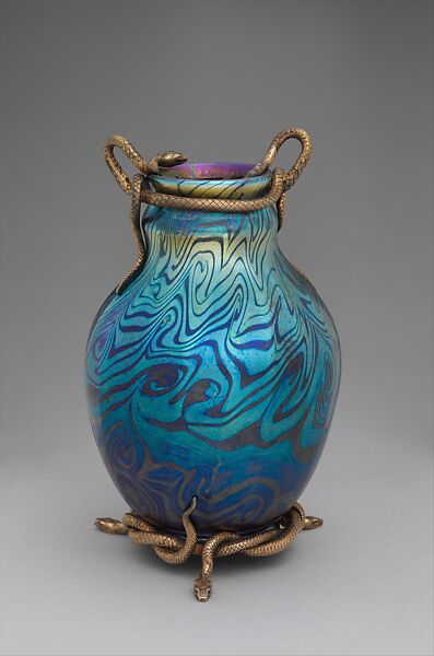 This silver-gilt and glass vase is one of a very few examples that represent the collaboration between Louis C. Tiffany and Tiffany & Co. in New York, Edouard Colonna in Paris, and the workshops of Fabergé in St. Petersburg, Russia. Tiffany glass with Fabergé mounts are very rare, and this exquisite example is particularly special in that it has its accompanying design drawing, a beautifully rendered watercolor (2014.698.1). The blown-molded vase in Tiffany’s trademark Favrile glass exhibits the artist’s signature turquoise color, further enhanced with pulled threaded decoration. The overall iridescence and luster are complemented by the ornate silver mounts in the form of intertwined snakes. The mounts are composed of two snakes on the rim and three on the base, each writhing and twisting around themselves. Expertly designed to create this imaginative work of art, the snakes at the rim appear to be crawling inside the vase while the lower mount rests upon the three snakes’ heads.