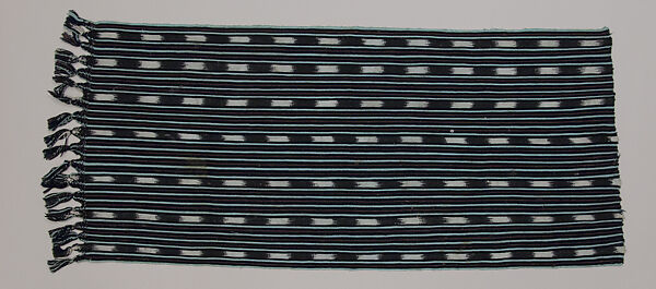 This tortilla cover is composed of tapestry woven cotton cloth of different colors of yarn, creating weft-direction stripes of browns, whites, and blues with a decorative fringe at one edge. It represents the importance of weaving in indigenous communities as social activities and as expressions of group identity. In the Guatemalan Highlands, the color patterns and designs woven into clothing signified a cultural and linguistic affiliation, in a mountainous landscape where over 15 different Mayan languages are still spoken today. In other words, one could recognize immediately where someone, either male or female, was from by the particular clothes they wore.