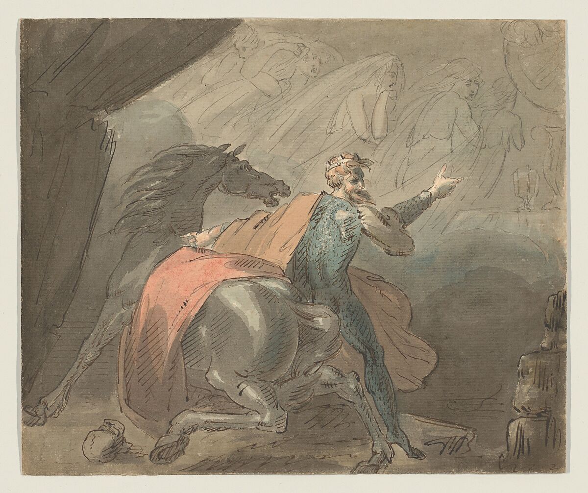 Hamilton belonged to a generation determined to expand the scope of the arts in Britain. He traveled to Rome as a teenager to study with Antonio Zucchi, returned to England to make decorative paintings for Robert Adam, then entered the Royal Academy Schools in 1769. From that point forward he focused on historical and literary subjects, together with portaits. This early drawing of an armored king with his horse, disturbed by a ghostly procession echoes a famous scene in Shakespeare's King Richard III, but may in fact illustrate a subject from Ossian.