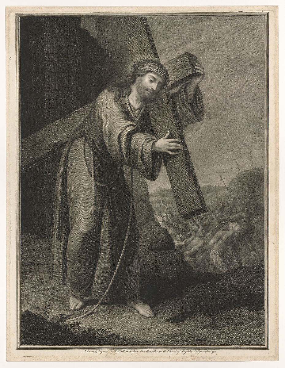 - Title: Christ carrying the cross, at right the two thieves on the road to Calvary, two crosses in the background, after Reni (?)