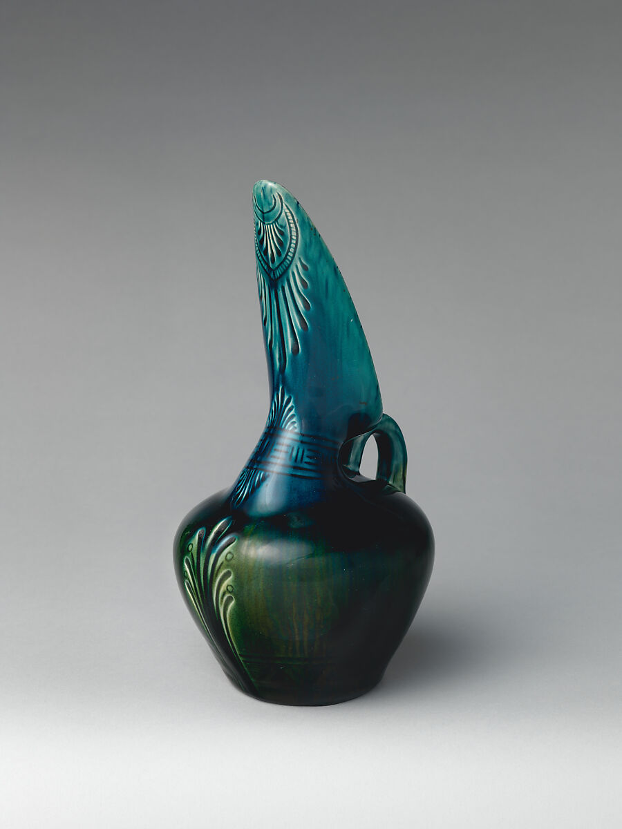 This jug and another of the same model manufactured by Ault Pottery (2016.178.5) represent a single Christopher Dresser model produced by two different factories at different dates. When Linthorpe closed in 1889, its molds were acquired by Ault Pottery. In 1893, Dresser signed a contract with Ault to produce new designs; the contract also stated that going forward, each piece should be marked with his facsimile signature.