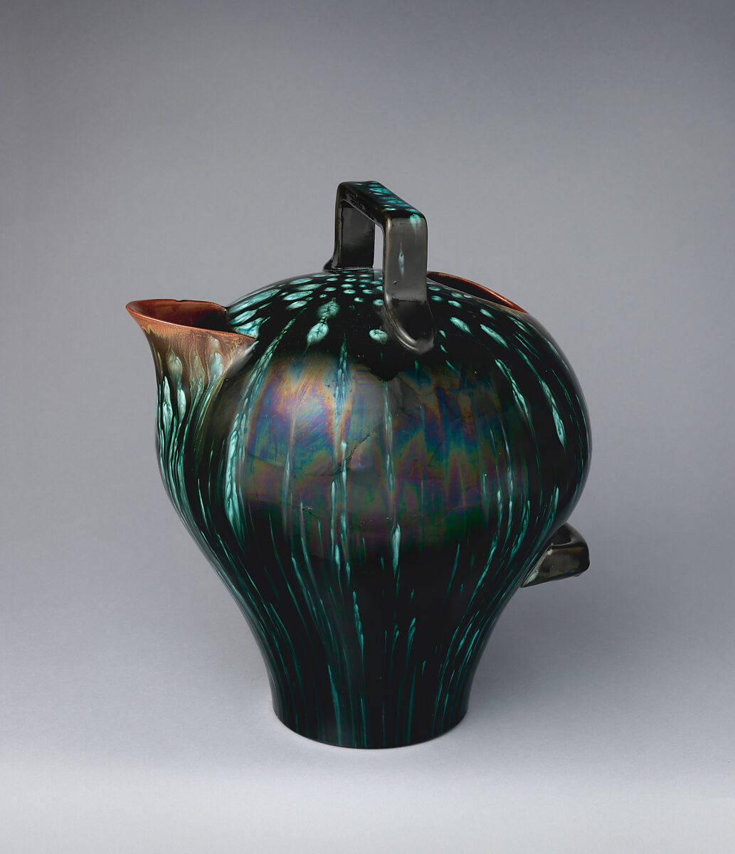 This jug shares a similar streaked blue-green glaze with another Christopher Dresser-designed vase (2015.122) in the Museum's collection.