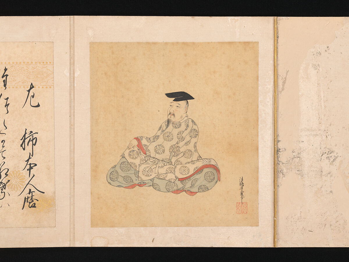 This album contains the imaginary portraits of thirty-six of revered masters of poetry from the Nara (710–794) and Heian (794–1185) periods, each accompanied by one of his or her verses on the facing page. Selections of the greatest poets were made by connoisseurs of the late Heian period, with Kakinomoto no Hitomaro (active 686–705), long regarded as the pre-eminent poet of Japan, given first place.