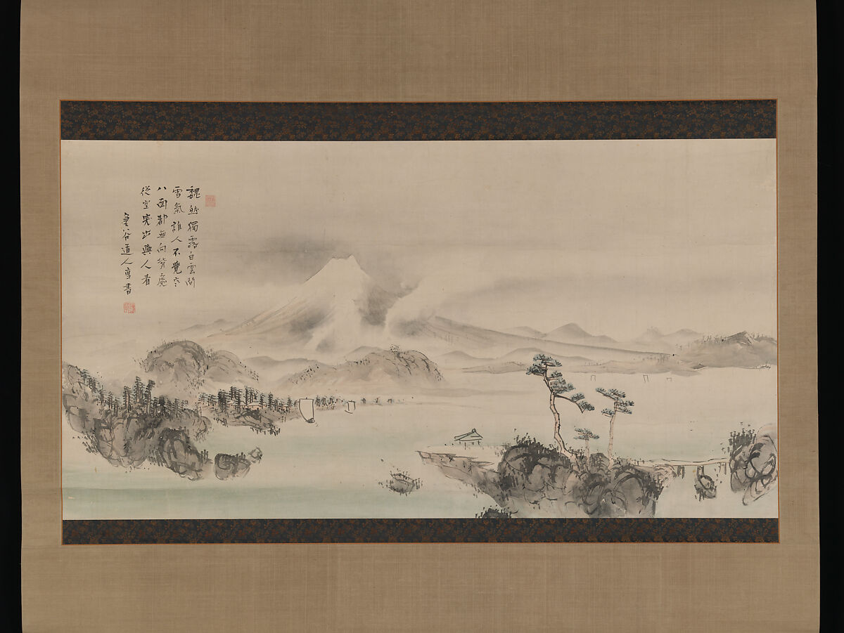 This large picture by the Nanga painter Yokoi Kinkoku shows a view from Suruga Bay of Mount Fuji with the Miho Pine Strand in the foreground. It is accompanied by a quatrain brushed by the artist himself: