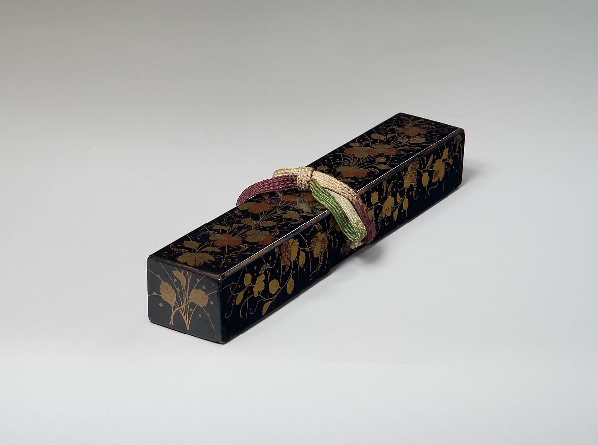 In the Momoyama period (1573–1615), a new style of lacquer decoration developed in Kyoto. Named after the Kōdaiji Temple, it catered to the tastes of the warlord Toyotomi Hideyoshi (1537–1598) for flamboyant furniture and household items decorated in gold. Using several relatively simple techniques, craftsmen conceived innovative, bold designs that did not require complicated underdrawings and allowed them to cover large surfaces in short amounts of time. The designs on this scroll box are executed in flat gold hiramaki-e with darker “pear-skin” hues to create a striking contrast with the black lacquer background.
