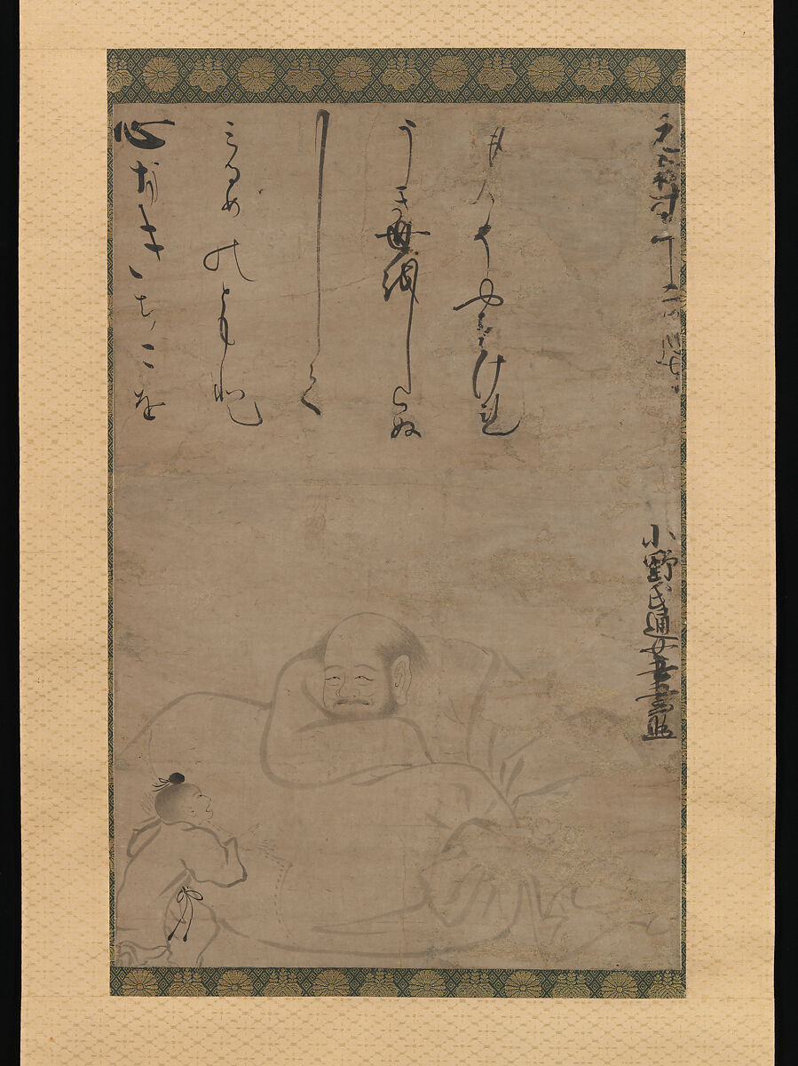 Ono no Ozū, renowned for her flamboyant brushwork, was one of the most prominent female calligraphers in premodern Japan. Here, her inscription above a picture of the Buddhist deity Hotei looking kindly at a child reads: “The eye that regards the innocent child / is a friendly soul outside this soiled world.”