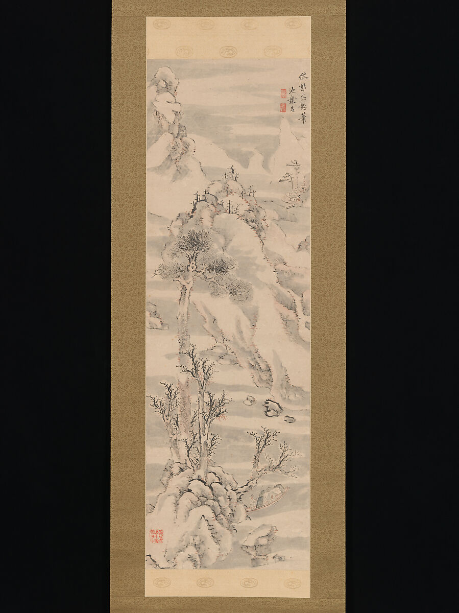 A small boat carrying the scholarly passenger, who might be on his way to visit a friend in one of the houses in the distance, is described by wavy, sharp, hard, and needle-thin lines. A cluster of smaller houses is seen in the distance at the right. The gray palette of the painting is highlighted by coal-black ink lines that delineate bare twigs of trees and rounded contours of hills and mountains. Ike Taiga’s inscription at the top right reads “After the brush of Guo Zhongshu, Ike Mumei” (Hō Kaku Chūjo hitsu Ike Mumei).