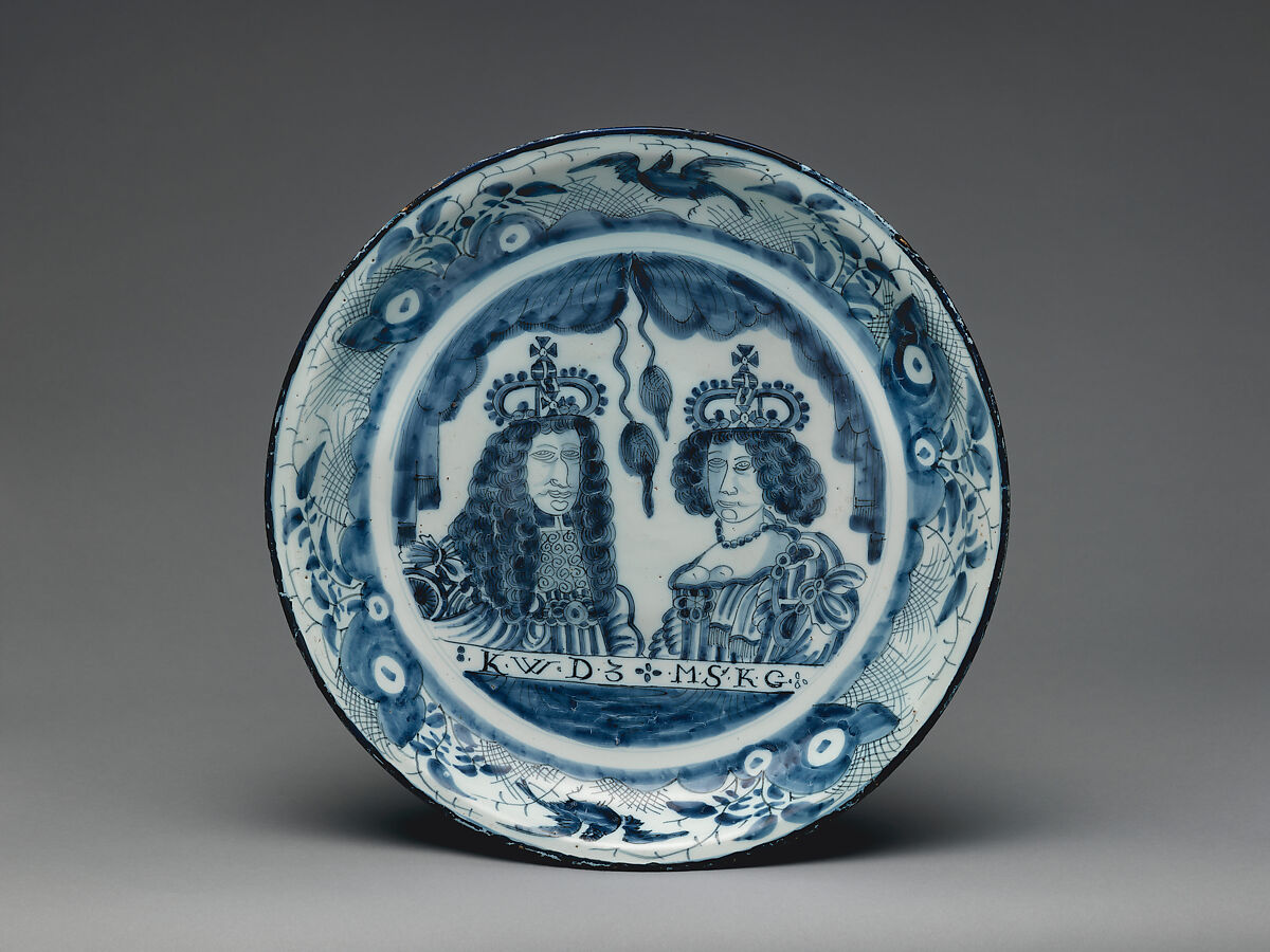 This Dutch delftware charger depicts King William and Queen Mary after the 1688 Glorious Revolution brought them to power and made them joint rulers of England. The bust-length portraits of the crowned monarchs are surrounded by a decorative border of birds, vegetation, and rocks.