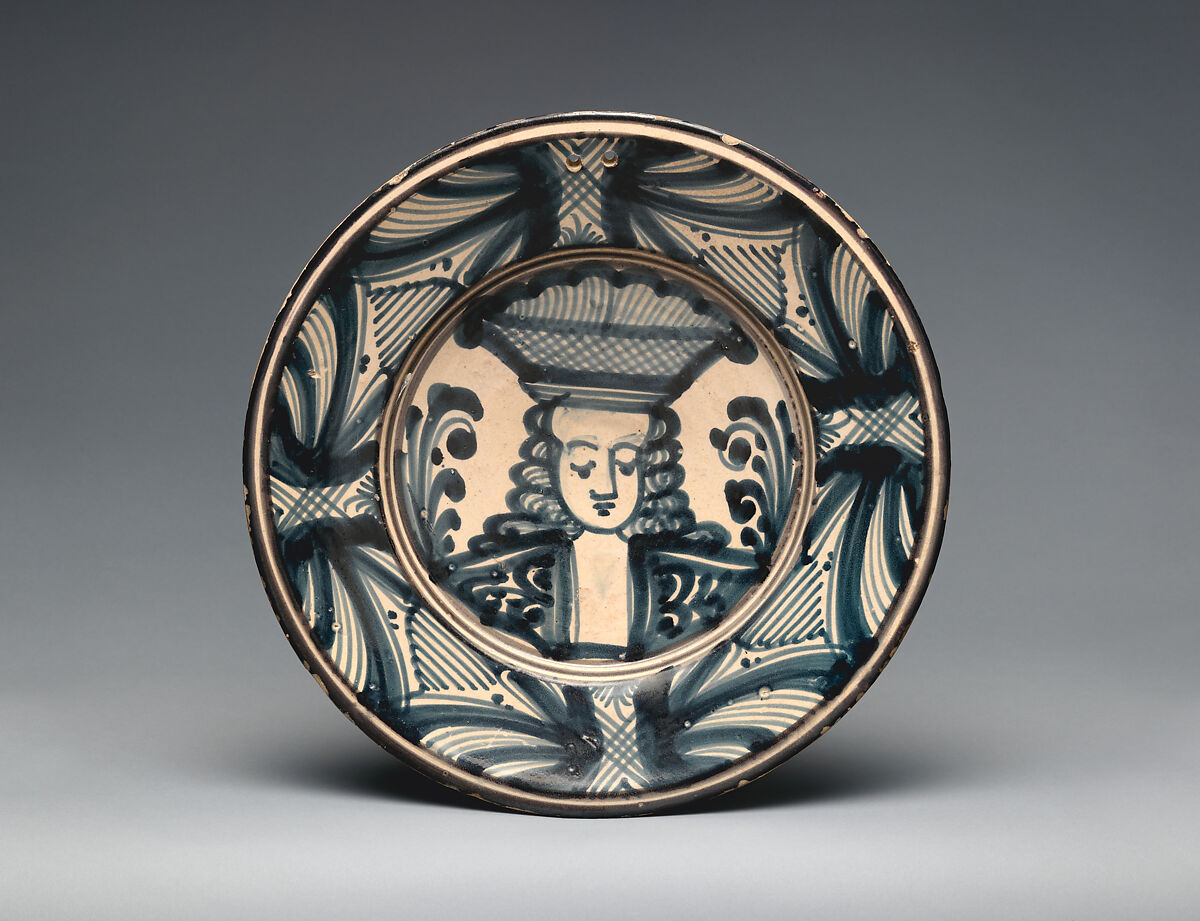 This tin-glazed charger features a man wearing a wig and what appears to be an elaborate hat or crown, surrounded by an abstract border of alternating thick and thin lines in cobalt blue. It was probably made in the late seventeenth century in Talavera or Puente del Arzobispo, two centers of pottery production in the Castile region of Spain.