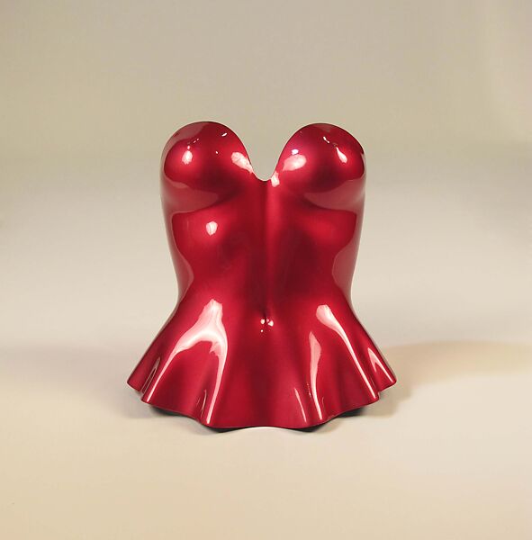 Issey Miyake’s plastic bustier, the finale of his autumn/winter 1980–81 collection, became a focal point of his “Bodyworks” exhibition, which toured internationally from 1983 to 1985. The installation featured designs that highlight Miyake’s interest in exploring the relationship between clothing and the body and his experiments with unorthodox materials, including plastic, rattan, and wire. The bustier, molded on a woman’s torso, subverts the idea of clothing as a covering separate from the body. It reveals the contours of the female form in detail, creating a second skin that transitions into a short peplum of fabric-like folds at the hips.