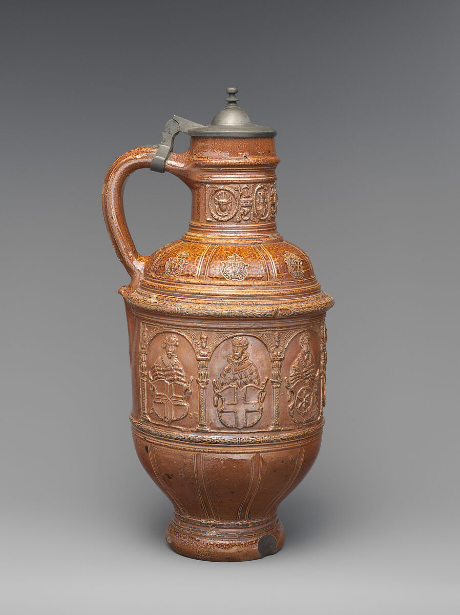 Molded low reliefs decorate this tankard, representing the seven electors of the Holy Roman Empire—the highest-ranking territorial rulers who were responsible for selecting the emperor. Raeren ceramicists produced prodigious numbers of jugs and tankards, and their workmanship was highly valued. Most of the city labored to support the large kilns. While the best pieces were likely to be exported by Dutch merchants to England and to colonists overseas in the Americas, many circulated in German markets as well.