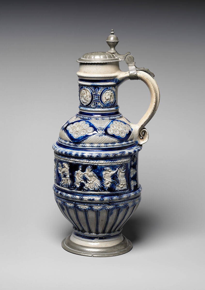 This tankard features molded low-relief decoration in cobalt blue and was probably produced in the Westerwald region of Germany in the first quarter of the seventeenth century.