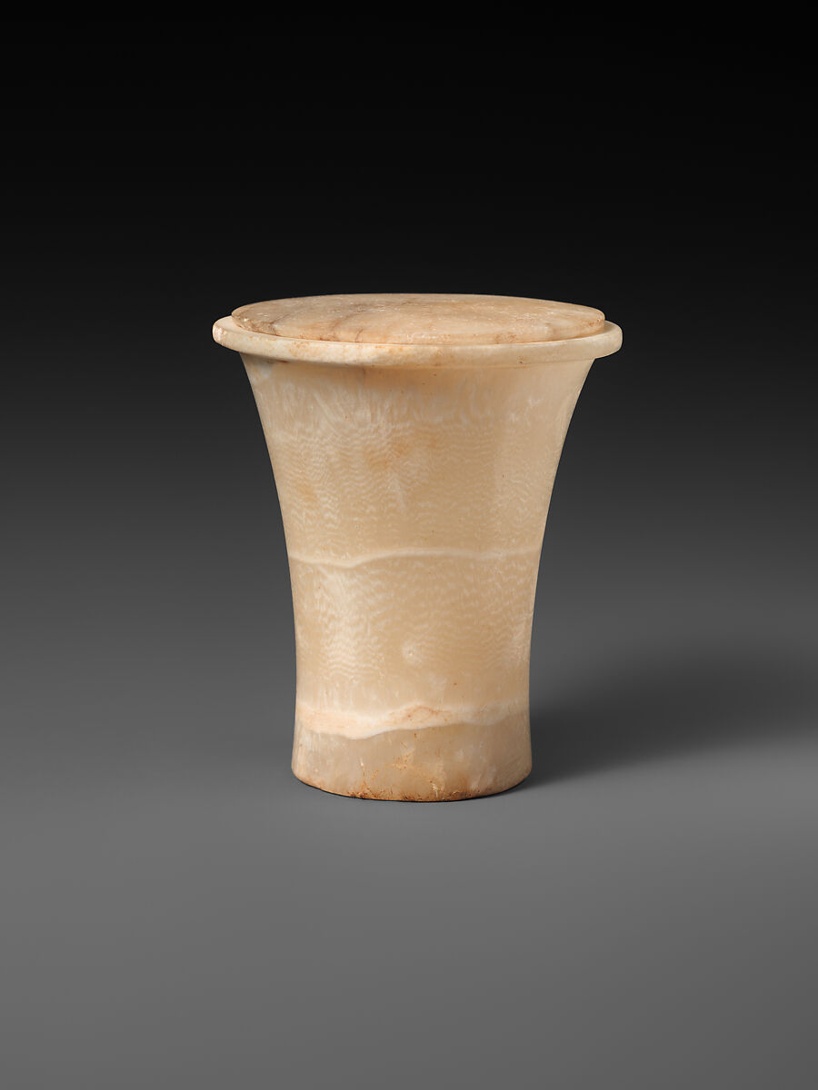This cylindrical jar with a flaring rim is a form generally used to hold ointment. The lid probably belonged to a different jar in the tomb because the lid is smaller than the rim of the base.