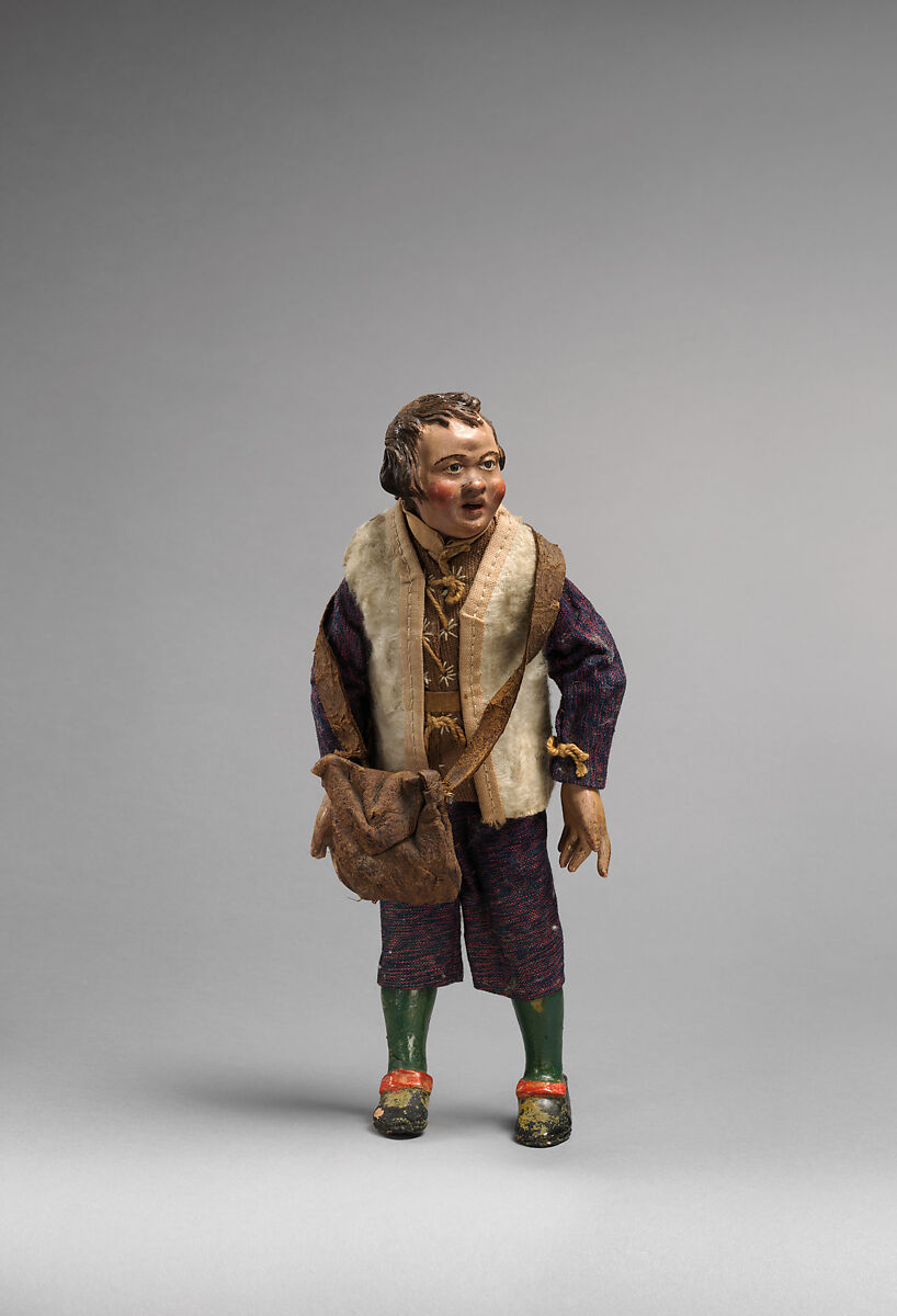 The practice of using crèche figures to restage religious events reached the height of its complexity and artistic excellence in eighteenth-century Naples, and the Metropolitan Museum of Art’s group of Neapolitan crèche is one of the finest and most complete survivals of the art form. The ensemble consists of characters traditional to eighteenth-century Italian Christmas holiday customs. The Nativity, featuring the holy family, shepherds and their flocks, and a host of angels and cherubs is joined by the procession of the three Magi, townspeople, colorful peasants, individuals from the Mediterranean shores, and animals. The figures have articulated bodies of tow and wire with polychromed terracotta heads, and are all in partially distressed condition.
