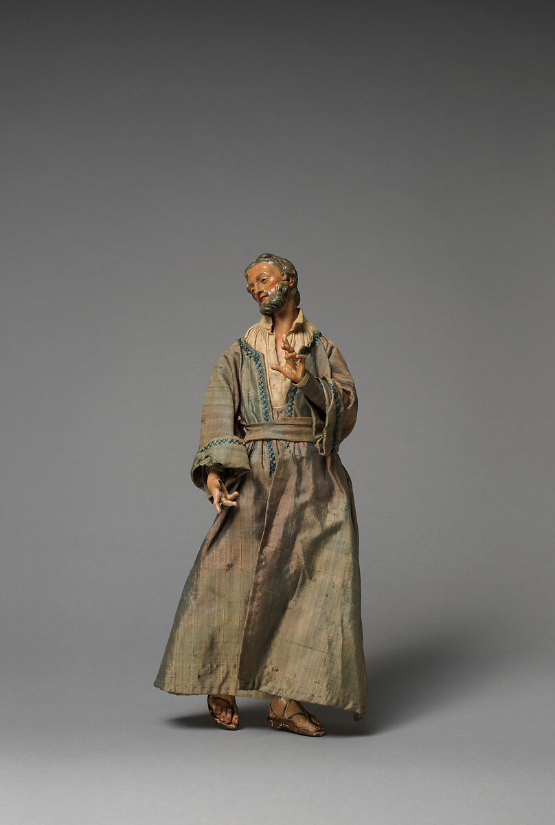 The practice of using crèche figures to restage religious events reached the height of its complexity and artistic excellence in eighteenth-century Naples, and the Metropolitan Museum of Art’s group of Neapolitan crèche is one of the finest and most complete survivals of the art form. The ensemble consists of characters traditional to eighteenth-century Italian Christmas holiday customs. The Nativity, featuring the holy family, shepherds and their flocks, and a host of angels and cherubs is joined by the procession of the three Magi, townspeople, colorful peasants, individuals from the Mediterranean shores, and animals. The figures have articulated bodies of tow and wire with polychromed terracotta heads, and are all in partially distressed condition.