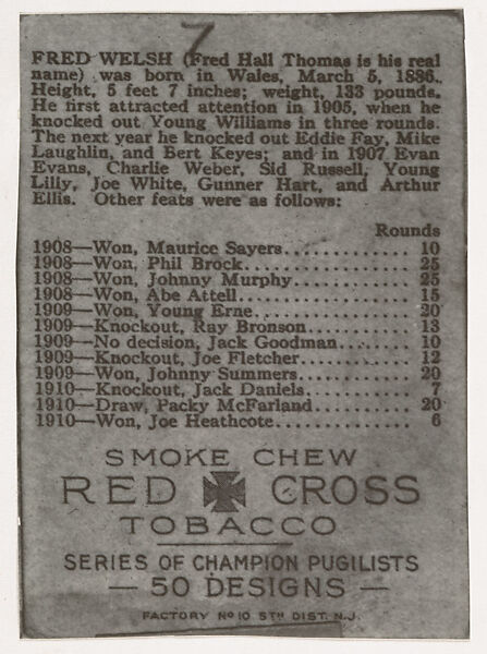- Title: Facsimile of trade card verso for Fred Welsh, from the Champion Pugilists series (T219), issued by Mecca and Hassan Cigarettes