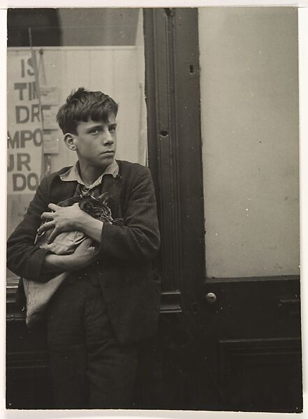 From 1930 to 1934 Maar turned her camera to the inhabitants of the streets of Paris and London, blending documentary and Surrealist modes. Her photographs often focus on socially marginal figures such as the poor or disabled, revealing her own political engagement. In this striking image, an adolescent with rumpled hair protectively grasps a cat to his chest, his gaze challenging Maar’s camera. The boy’s expression and posture imbue this chance encounter—and the composition—with an arresting psychological dimension.